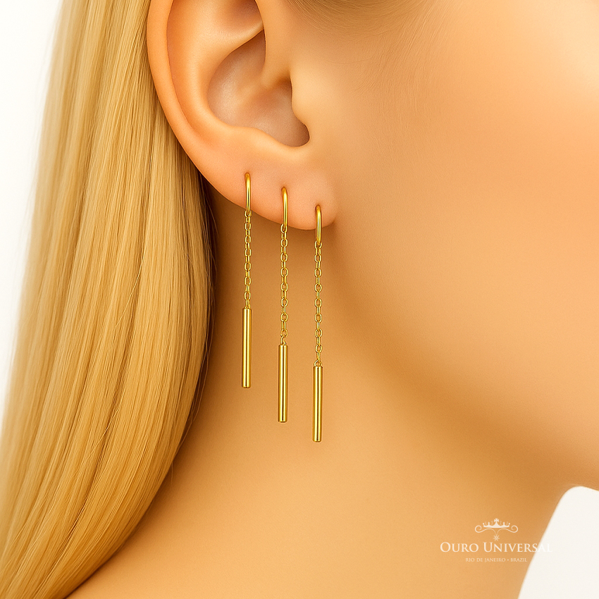 Brinco delicado e moderno, composto por uma haste fina curvada que encaixa diretamente no furo da orelha, formando um visual minimalista e elegante. A joia proporciona um aspecto luxuoso e contemporâneo. O comprimento alongado valoriza o pescoço e traz um toque de glamour discreto.